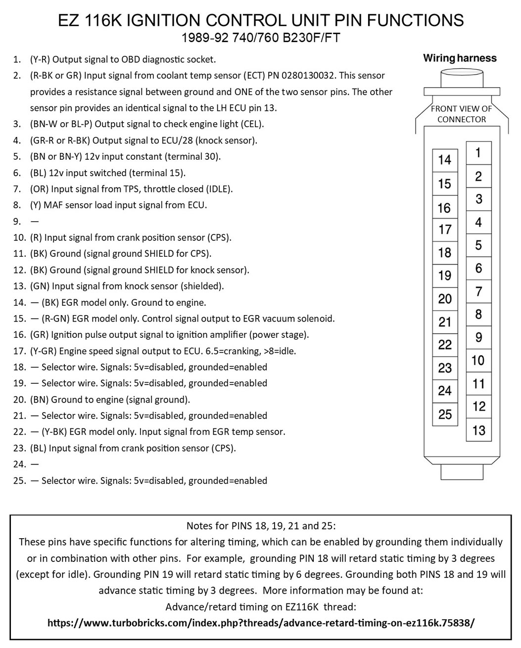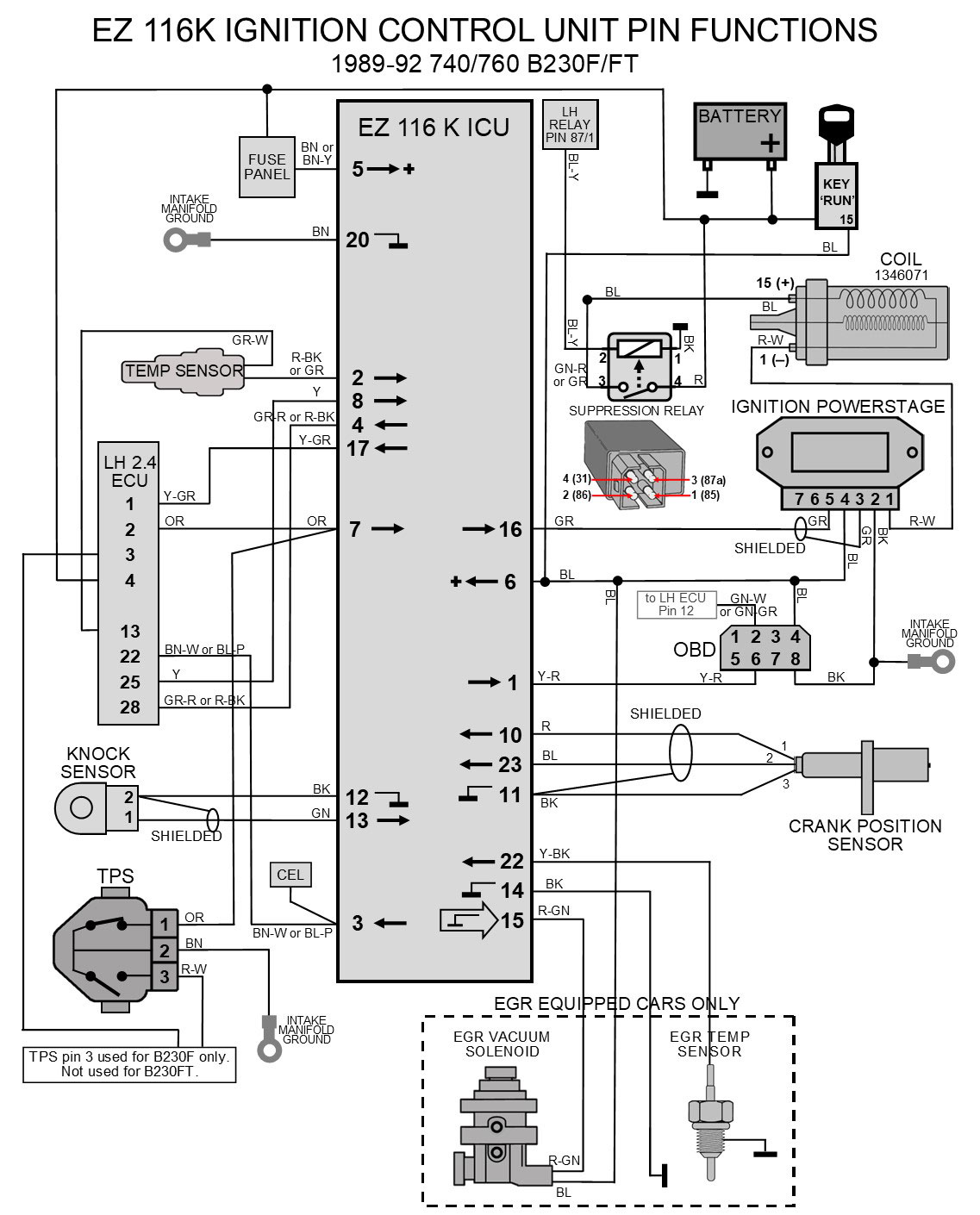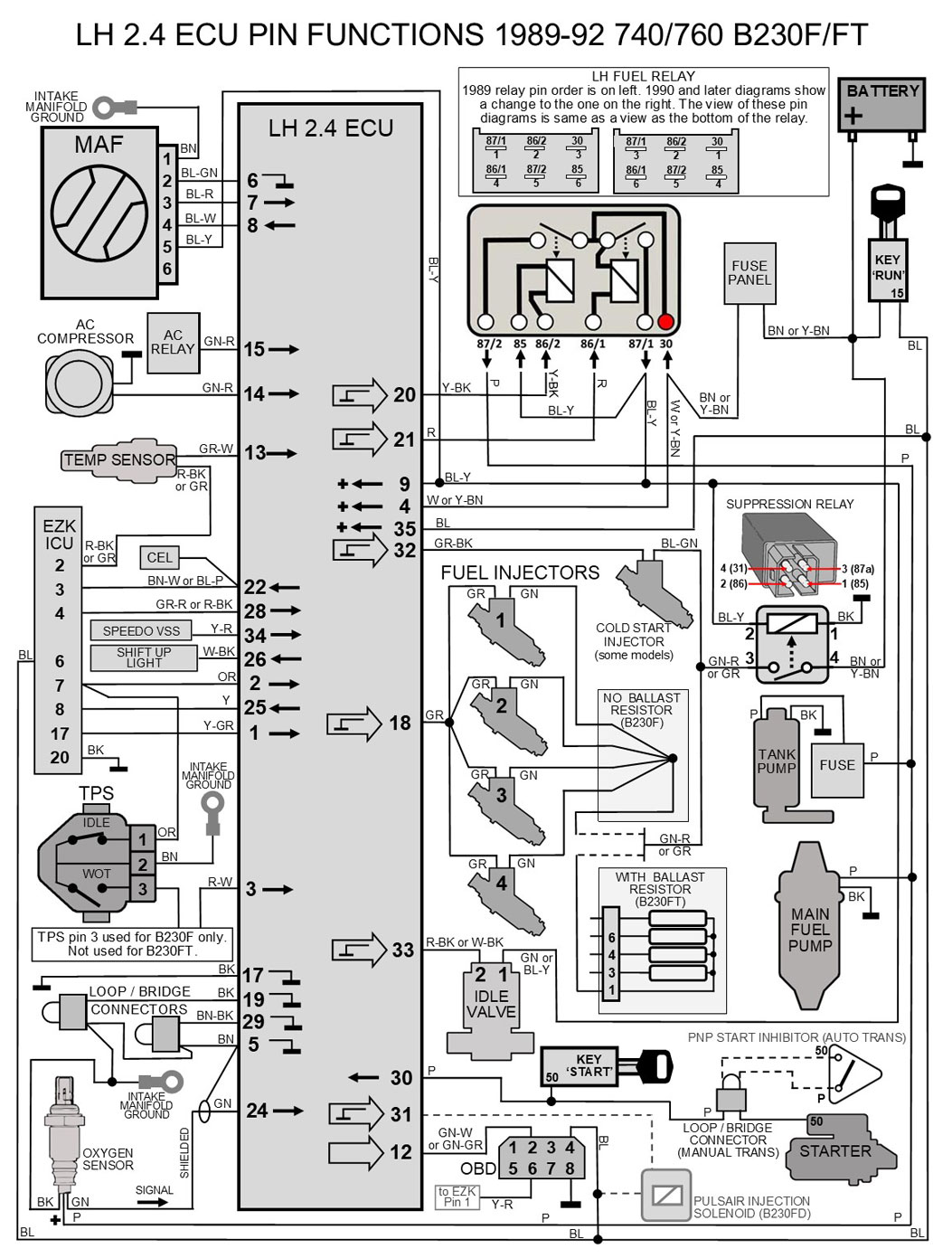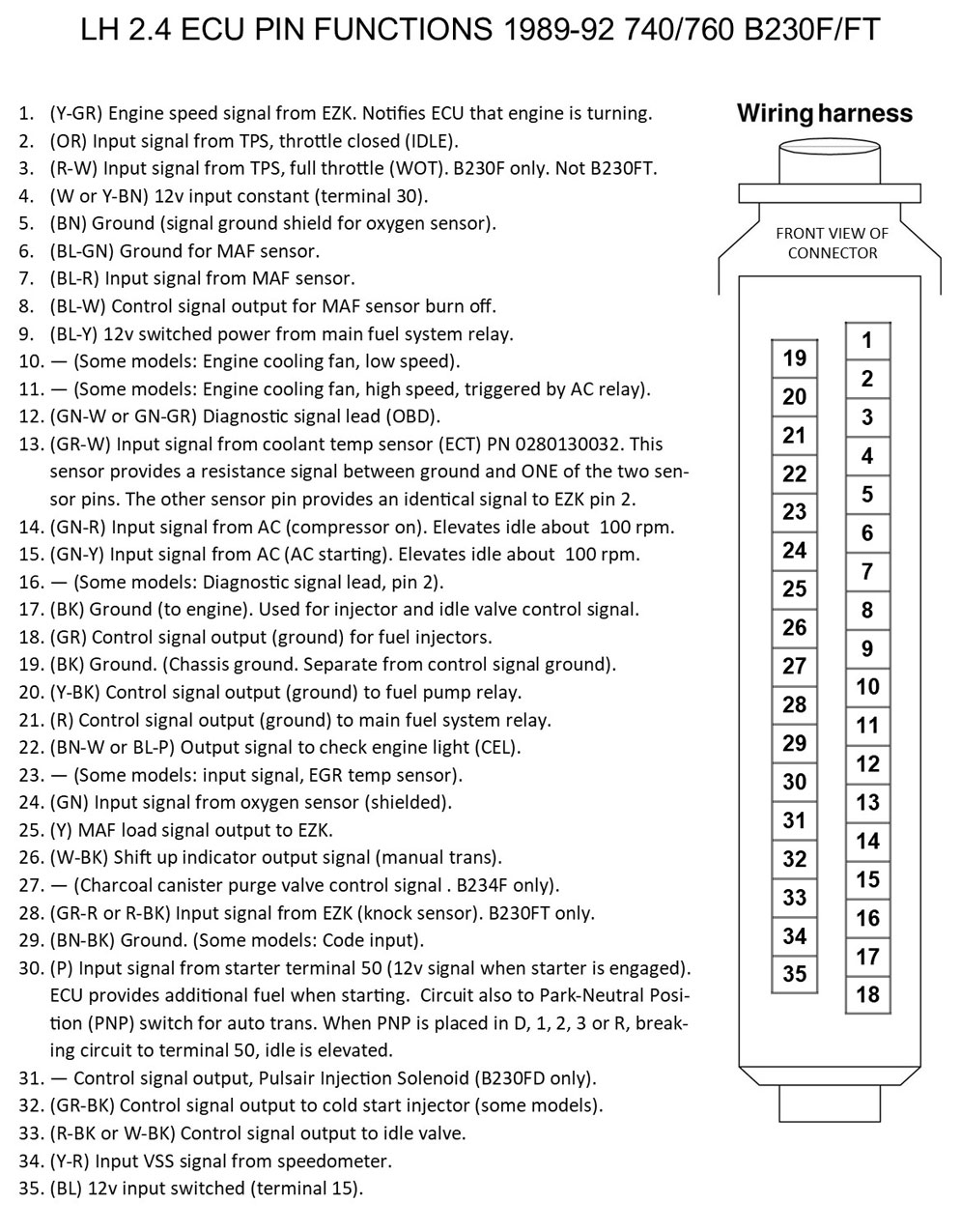 | Pin Function Diagrams 740/760 4 cylinder B230F (1989-92) or B230FT (1990-92) with LH 2.4 EFI and EZK Ignition |