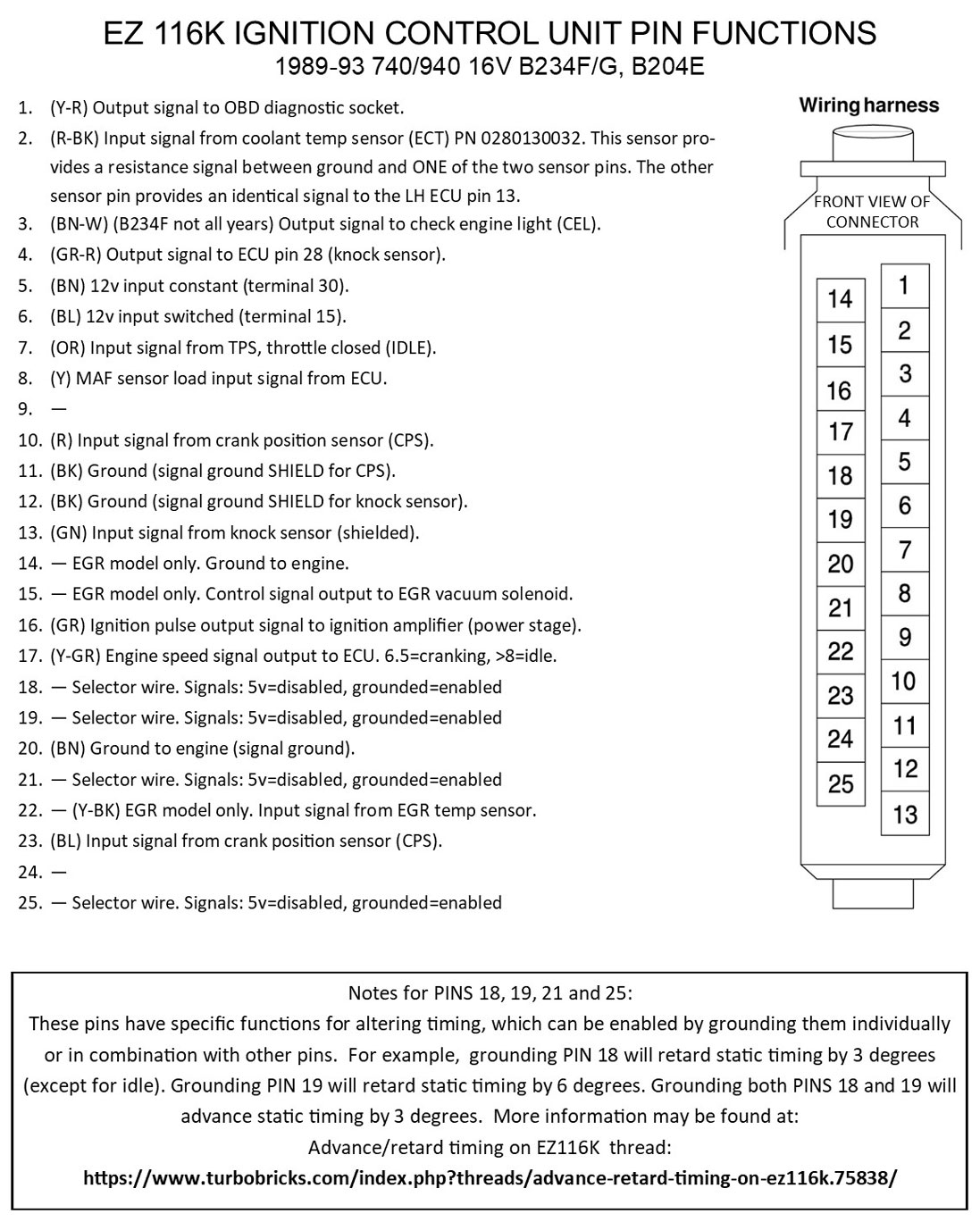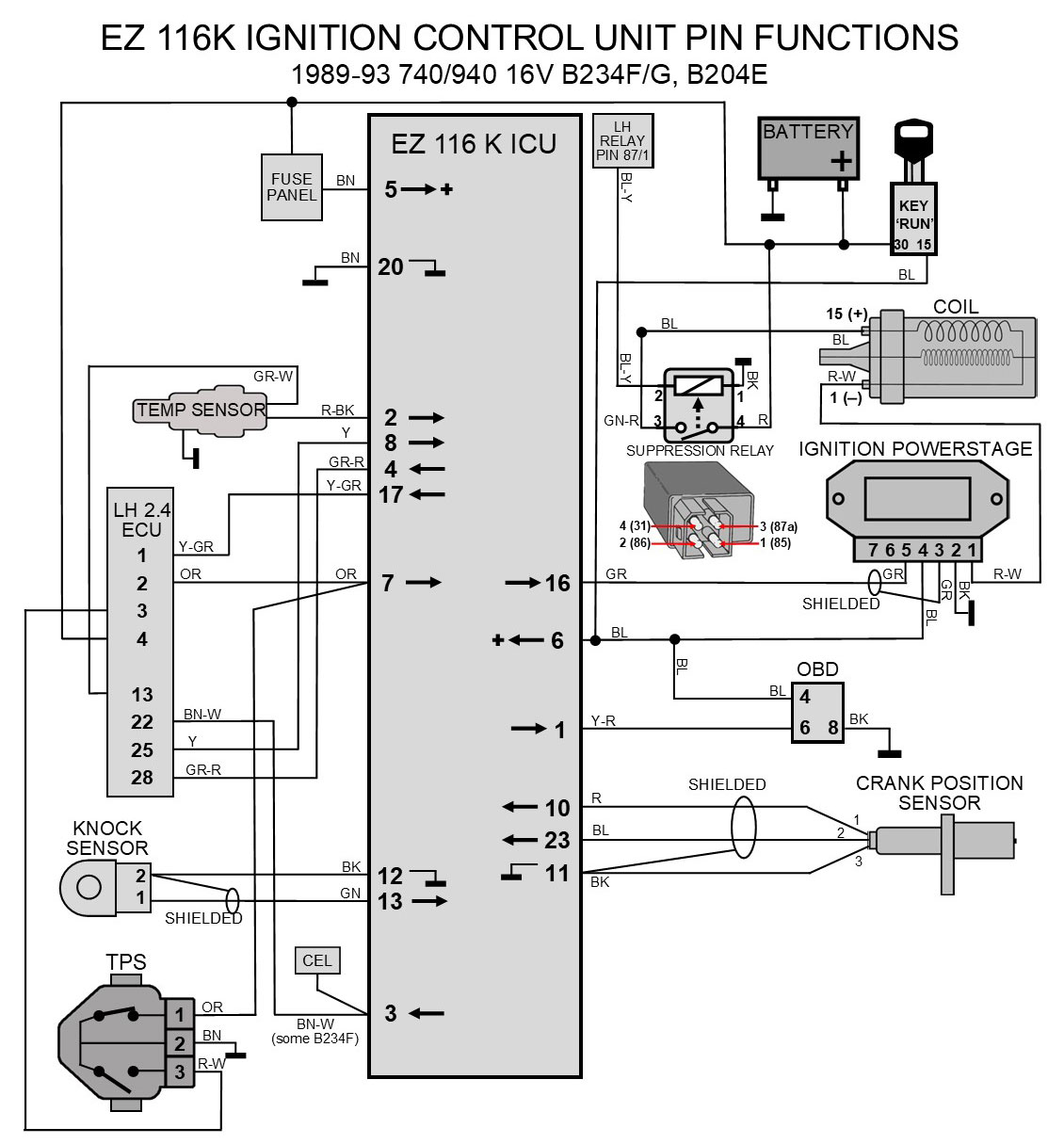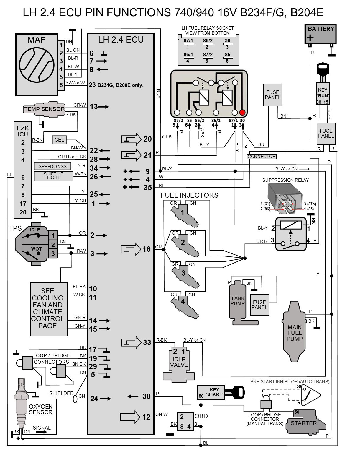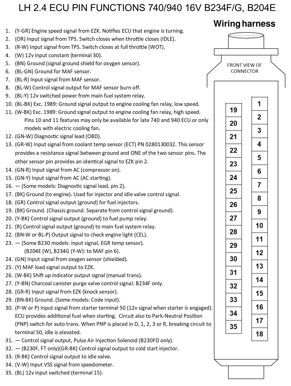 | Pin Function Diagrams 740/940 4 cylinder 1989-93 16-valve B234F/G, B204E, LH 2.4 with EZK Ignition |
