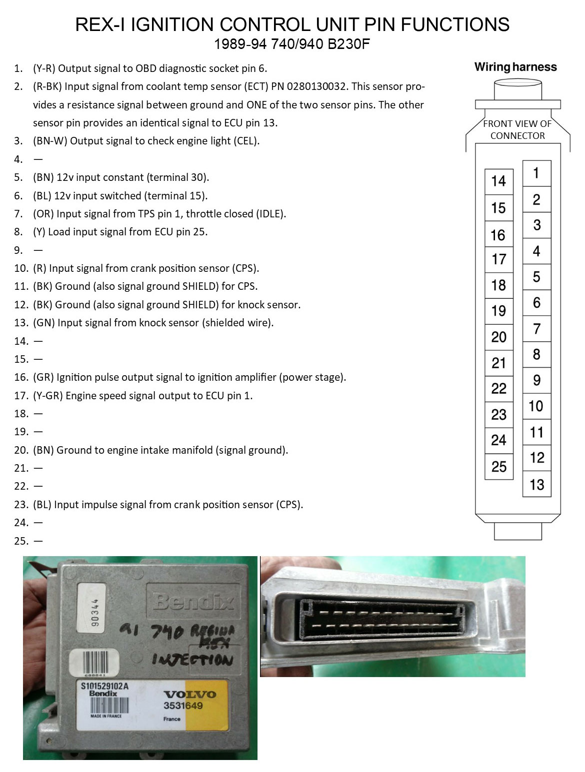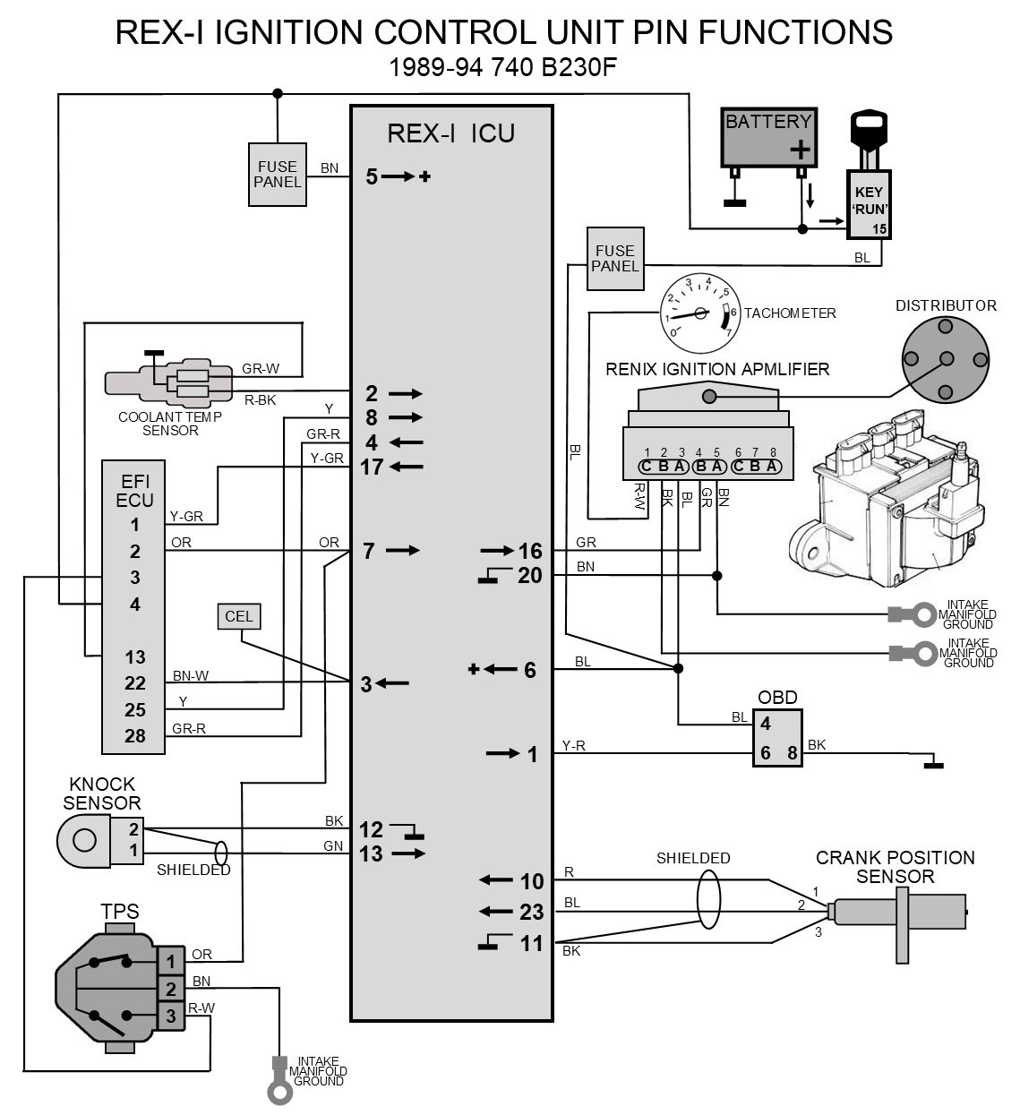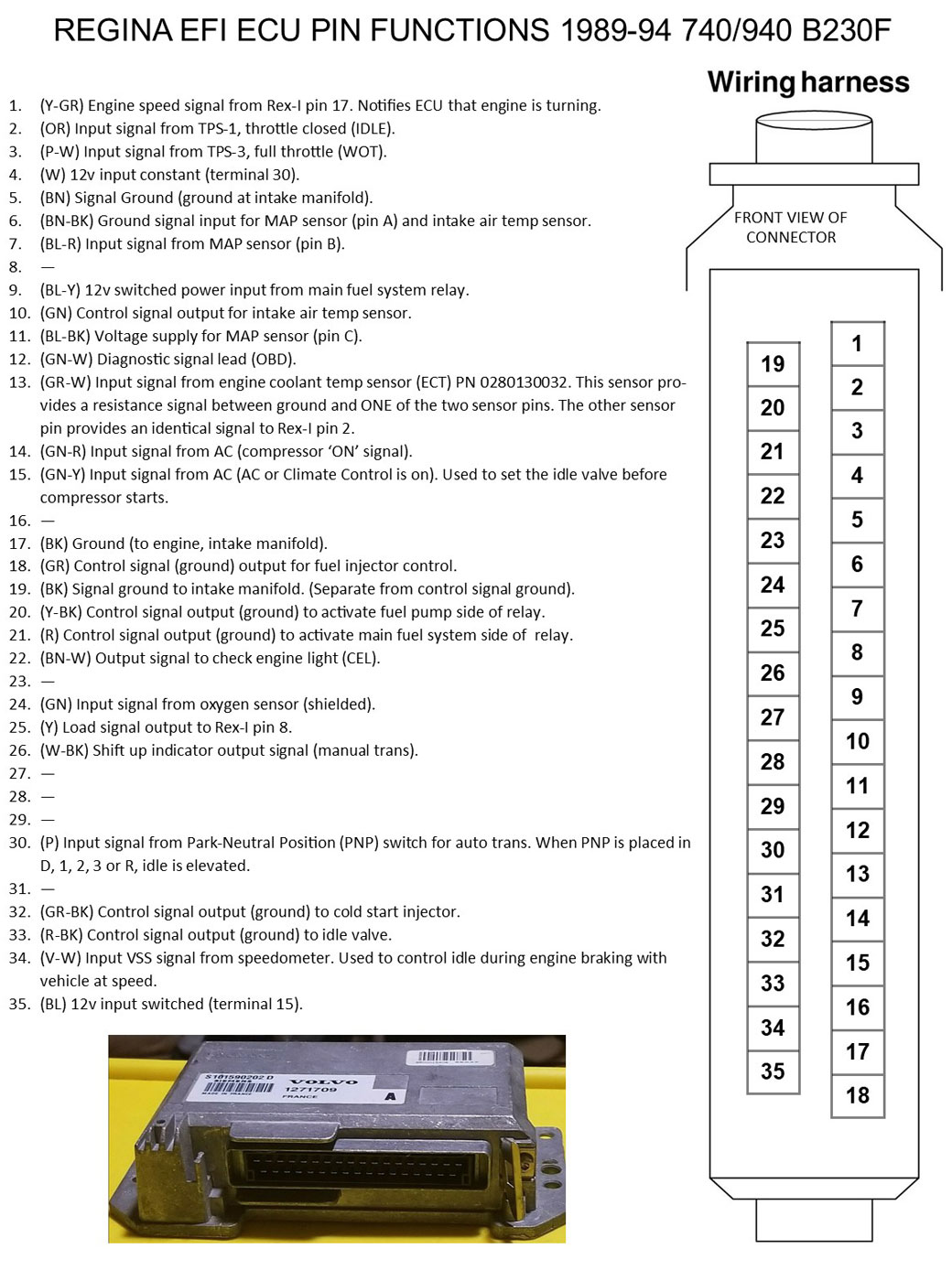 | Pin Function Diagrams 740/940 4 cylinder B230F 1989-94 REGINA EFI with Rex-I Ignition |