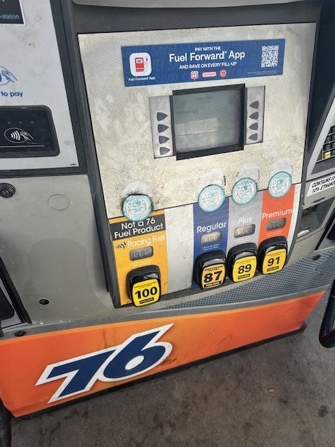 Newport Beach ![]() ![]() Graham's Newport Hills Union 76 2690 San Miguel Rd., Newport Beach CA (corner of Ford Rd) 949-644-7151 Hours: 6 AM - 10 PM, 7 AM - 10 PM on Sundays. 100 octane unleaded fuel at the pump (TWO PUMPS) Update 08/03/25 $9.99 Labeled as 101 octane at pump. |
