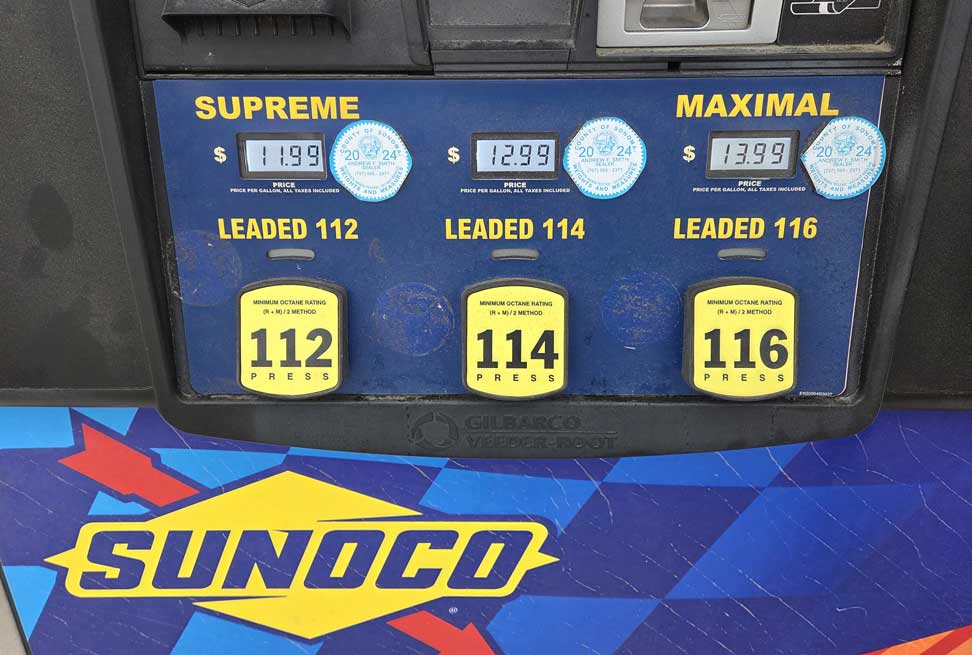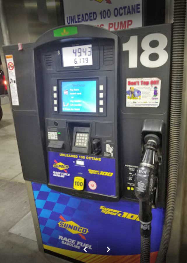 Pleasanton)![]() ![]() Sunol Super Stop 3004 Andrade Road, Sunol, CA (925) 862-0577 It's just off Hwy 680 on Adrade Road, about 500 feet East of the exit. Above PHOTO of Sunol pump taken 2013. Torco 101 unleaded at the pump 08/18/16. Also 94, 96 and 98 octane unleaded at the pump. Also available: 5 gallon pales of 112, 114, and 118 leaded 08/18/16 |
