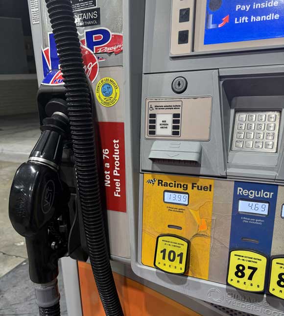 | Rosamond (near Palmdale) Willow Springs Raceway 661-256-2471 http://www.willowspringsraceway.com/ 101 octane unleaded at pump inside track facility 03/22/25 $12.00 $10 admission most weekend events. No admission fee if purchasing fuel only. |