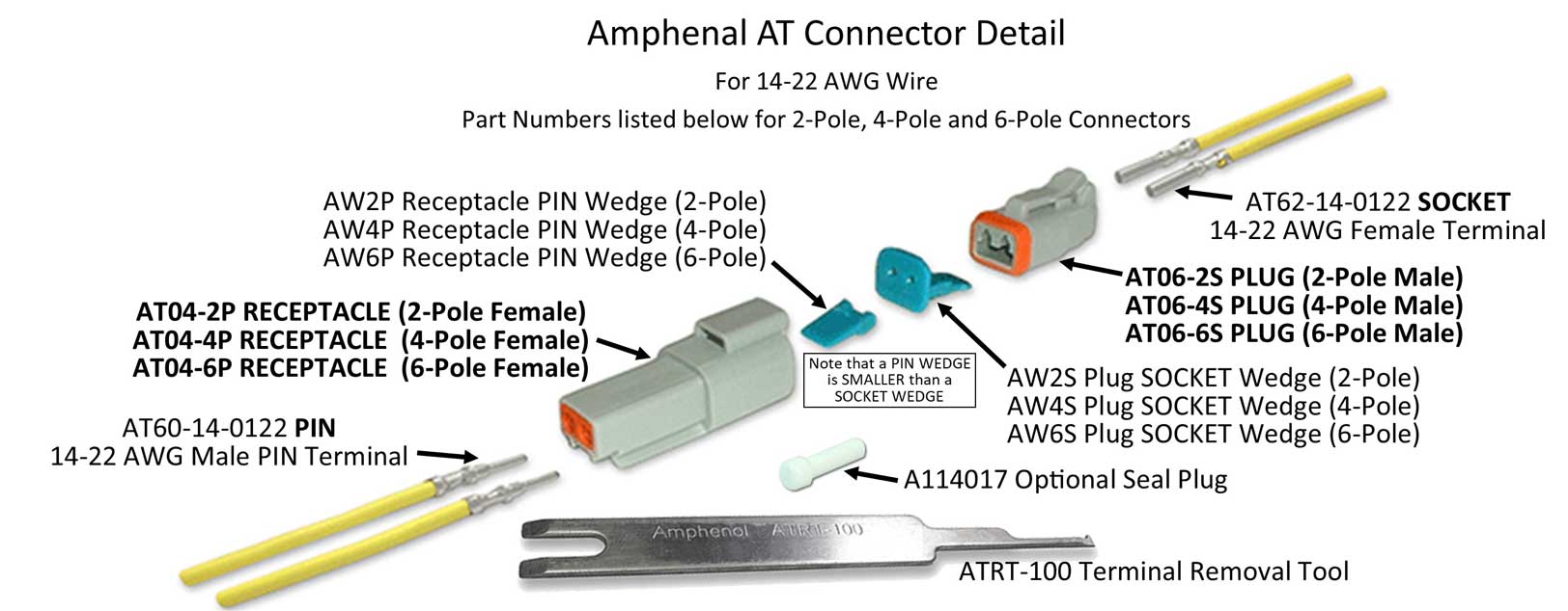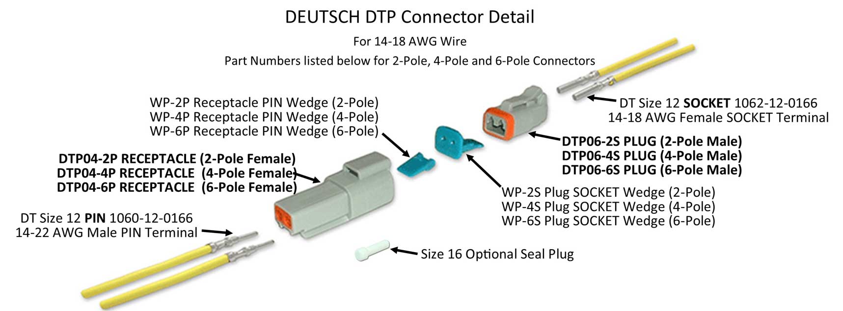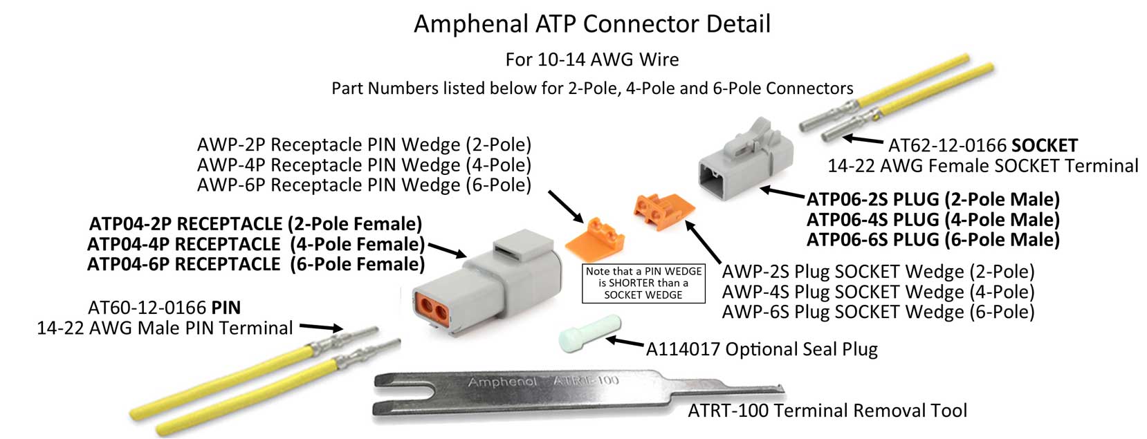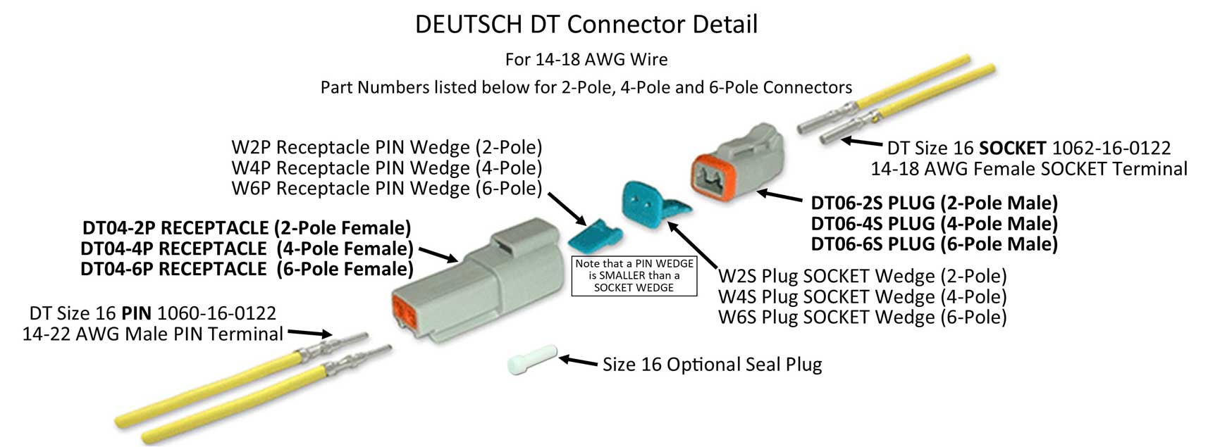 (Amphenol AT equivalent connectors are further below CLICK HERE) Hard to spell, but Deutsch connectors are very good. Fully sealed, easy to use connectors suitable for almost any automotive application. Deutsch connectors are sold by TE Connectivity, formerly Tyco Electronics. I like these connectors, so I thought I'd highlight them here. I don't offer these in my pages because they're available pretty much everywhere. But I use them and they are great connectors. Most common types used for automotive: ![]() ![]() DT Connectors: 14-18 AWG, rated up to 13A. Uses Size 16 contacts (terminals). https://www.mouser.com/new/te-connectivity/te-deutsch-dt-series-connectors/ HIGHER CURRENT CONNECTORS ![]() ![]() DTP (Power) Series Connectors: 10-14 AWG, rated up to 25A. Uses Size 12 contacts (terminals). These are for higher amp power connections up to 25 amps. https://www.mouser.com/new/te-connectivity/te-deutsch-dtp-connectors/
