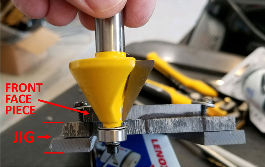 I wanted to be sure. So measure twice, cut once. After some measuring and deliberation, I decided that the bevel would need to be 30 degrees to appear correct with the 1/4 inch PVC. So I bought this 30 degree router bit with a ball bearing. I don't own a router and I didn't plan on buying one for this one-time use, so I rigged a way below with my drill and vise. ![]() |