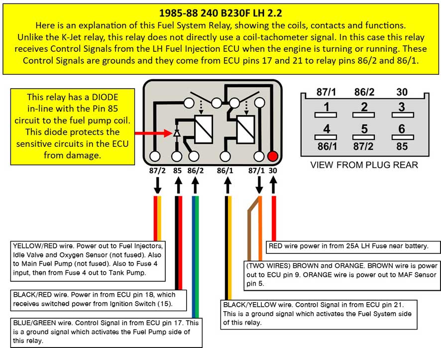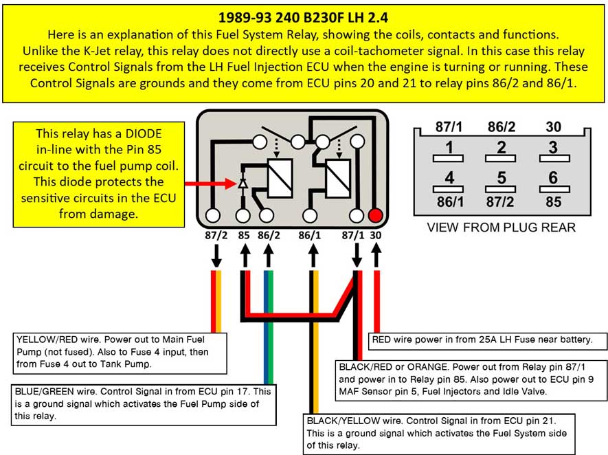 Typical 240, 740, 940 Fuel Pump Wiring Circuits 240 Fuel pump and fuel pump relay circuits can be a mystery. Here are some general diagrams showing how they were done over the years. Keep in mind that these diagrams, which were originally created by Volvo, are not always accurate. Sometimes there are small differences found on the actual cars. Sometimes it's a different wire color or sometimes a different wire path, but generally these diagrams can be useful.