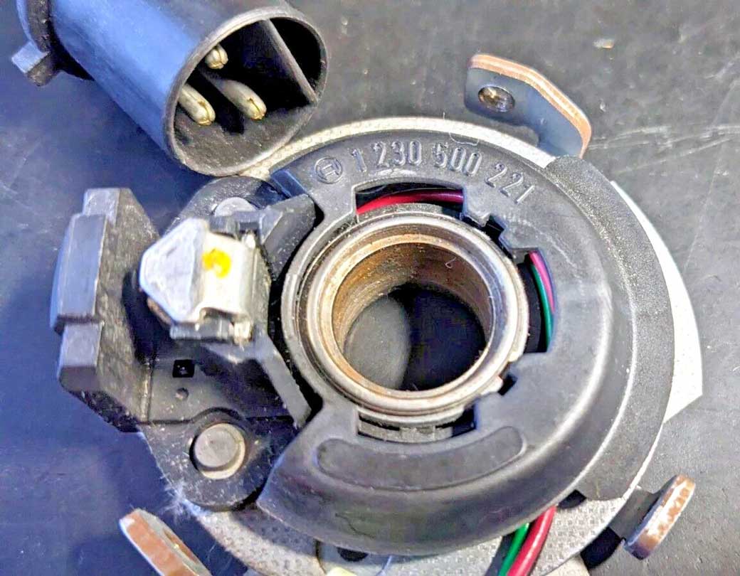 A 240 with Breakerless Ignition uses a BALLAST RESISTOR in the Coil Power Circuit, which is fully explained in the Ballast Resistor info below. Detailed FUNCTION DIAGRAMS for this ignition can be found in my page. 2. Computer Controlled Ignitions (Chrysler designed) These Computer Controlled Ignitions began with 1981 240s equipped with Bosch K-Jetronic mechanical fuel injection (engine designation: B21F MPG). This Chrysler designed ignition was carried over to the 1982, '83 and '84 240 non-turbo. The 1983-84 240 with a B23F changed to Bosch LH 2.0 and LH 2.1 electronic fuel injection. This ignition can be quickly recognized by a larger ignition control unit mounted under the hood on the right inner fender. 1981 to 1982 cars would have a distributor with a WHITE distributor cap. For 1983 these cars might have a WHITE distributor cap or a RED distributor cap, but the ignition internal design and the control units were the same (although parts numbers did change). For 1984, most 240 with the B23F would have a RED distributor cap. Distributor Part Number (WHITE Distributor CAP): 1981-82 240 with B21F and some 1983 240 with B23F: Volvo PN 1306059. Distributor cap PN 1306210. Rotor PN 1332125. ![]() Hall generator breaker plate for WHITE cap distributor (with ROUND CONNECTOR): Volvo PN 1332207. ![]() Distributor Part Numbers (with RED Distributor CAP): 1983 240 with B23F: Volvo PN 1332684, Bosch 0 237 032 002 (Note some 1983 models got the white cap distributor above). 1984 240 with B23F: Volvo PN 1336737, Bosch number 0 237 506 003. Distributor cap PN 243797. Rotor PN 1336240. This distributor looks similar to the below 1985-88 type. Note that the pictured distributor below has a RECTANGULAR 3-pole connector. ![]() There are some cases where a 1983 RED cap distributor came with a ROUND 3-pole connector identical to the connector on the above white cap distributor. So far this distributor has been identified as being marked Bosch 0 237 032 001. ![]() These distributors have a centrifugal advance mechanism inside, but no vacuum diaphragm. This distributor does not have a vacuum advance diaphragm. For this system, the Ignition Control Unit will have vacuum diaphragm. ![]() Distributor Hall Sensor with RECTANGULAR connector: Volvo PN 1346803, Bosch 1 237 031 166. (Reportedly this also fits the early 1985 B230F distributor Volvo PN 1332587, Bosch 0 237 506 001). More information see HALL SENSOR NOTES below. ![]() Distributor Hall Sensor with ROUND connector: Volvo PN 1336432, Bosch 1 230 500 221. Came in the RED cap distributor marked Bosch 0 237 032 001. More information see HALL SENSOR NOTES below. ![]() Ignition Control Unit Part Numbers: 1982 240: Volvo PN 1317873. 1981-84 240: Volvo PN 1317295. 1984 240: Volvo PN 1346105. These ICUs all came with vacuum advance diaphragm canisters.