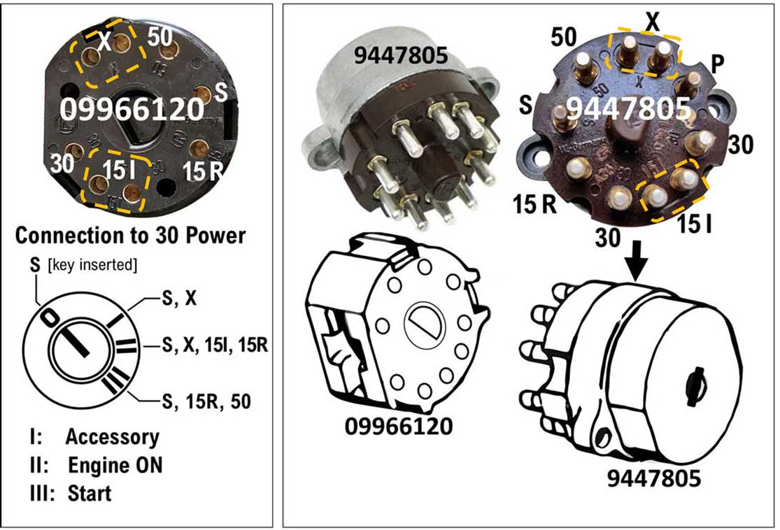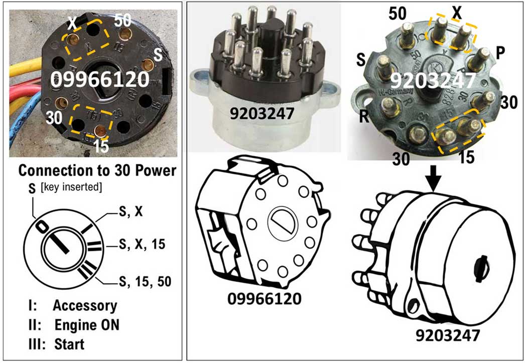 PN 9203247 switch has 10 pins, however only 5 circuits are actually used for this switch in a 1975-89 240. Pins for 9203247: 30, S, X, 15 and 50. Pin 30 delivers direct battery power to the switch. Pin S energizes the Key-In Chime or Seat Belt Warning Chime. Pin X provides KEY-ON power to the fuse panel for AC Fan, Wipers, Horn, Radio, Cigarette Lighter and Power Mirrors. Pin 15 provides KEY-ON power to EFI and Ignition ECUs, Speedo, Dash Gauge Cluster, and some other items through the Fuse Panel, such as Power Windows, Heated Seats and Heated Rear Window. Pin 50 energizes the Starter when the key is turned to the start position. ![]() PN 09966120 female harness receptacle 1975-89 240: The image above and below shows the RECEPTACLE or SOCKET for the ignition switch, which is found in the dash. This receptacle is part of the dash harness in a 240. This same part housing (with same embossed part number on the housing) was used for all 240, 740, and 940 models, however the actual number and arrangement of the circuits and wire colors varied for different models. For the 1975-89 240 this receptacle has 5 pin circuits mating to the ignition switch, which are detailed below. ![]() The receptacle pictured above came from a 1984 240 dash harness. Switch 9447805 for 1990-1993 240. This switch has 10 pins also, however only 8 circuits are actually used for the 1990-93 240. Pins for 9447805: 30, S, X (x2), 15I (x2), 15R and 50. Pin 30 delivers battery power to the switch. Pin S energizes the Key-In Chime or Seat Belt Warning Chime. Pin X (2 pins) provides KEY ON power to the fuse panel for AC Fan, Wipers, Horn, Radio, Cigarette Lighter and Power Mirrors. Pin 15I (2 pins) provides KEY ON power to the Speedo, Dash Gauge Cluster, Headlight Switch, and some other items through the Fuse Panel, such as Power Windows, Heated Seats and Heated Rear Window. Pin 15R provides KEY ON power to the ECUs and to the fuse panel for Turn Signals and Reverse Lights. Pin 50 energizes the Starter when the key is turned to the start position. ![]() PN 09966120 female harness receptacle 1990-1993 240: The image above and below shows the RECEPTACLE or SOCKET for the ignition switch, which is found in the dash. This receptacle is part of the dash harness in a 240. This same part housing (with same embossed part number on the housing) was used for all 240, 740, and 940 models, however the actual number and arrangement of the circuits and wire colors varied for different models. For the 1990-93 240 this receptacle has 8 pin circuits mating to the ignition switch. These are detailed below. ![]() |