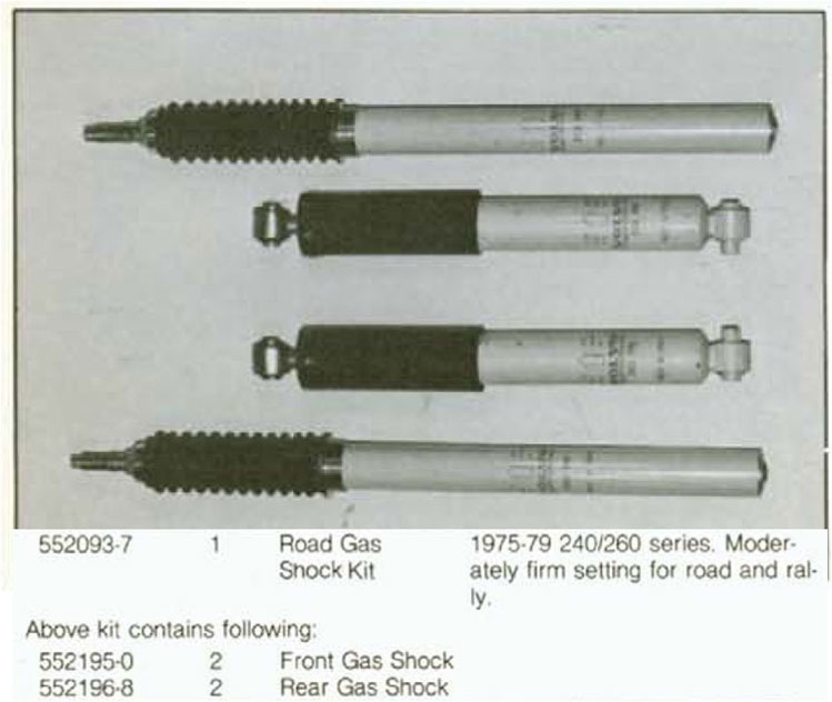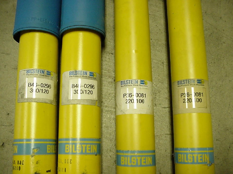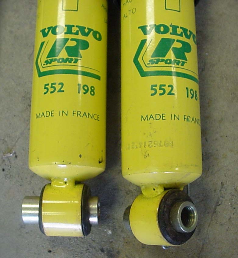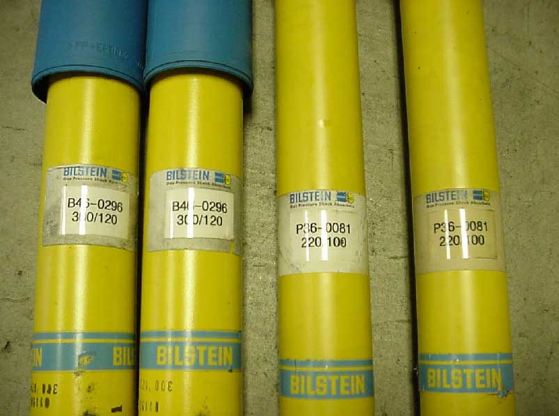 Custom re-valved Bilstein shocks and struts. Update note April 2003: The below shock/strut setup was changed to adjustable coil-overs with R-Sport shocks. Scroll down for details. Some of you may have heard my complaints that I felt the HD "Heavy Duty" Bilsteins that I had previously installed in my 245 (October 2000) were too soft, particularly at the rear. I was experiencing an unpleasant amount of rebound... most noticeable at the rear, especially when adding passengers to the back seat or a load in the cargo area. This was while using ipd Sport Springs. I think these rear shocks may be just right for a sedan (I later put them on my 242 DL with iPd springs and they were fine), but I felt they were inadequate for my heavier wagon (it weighed 3240 lbs. empty). I