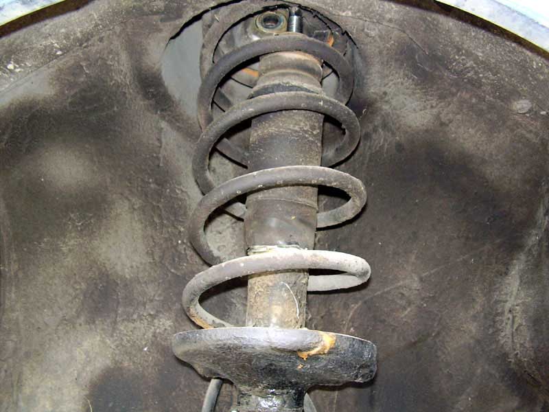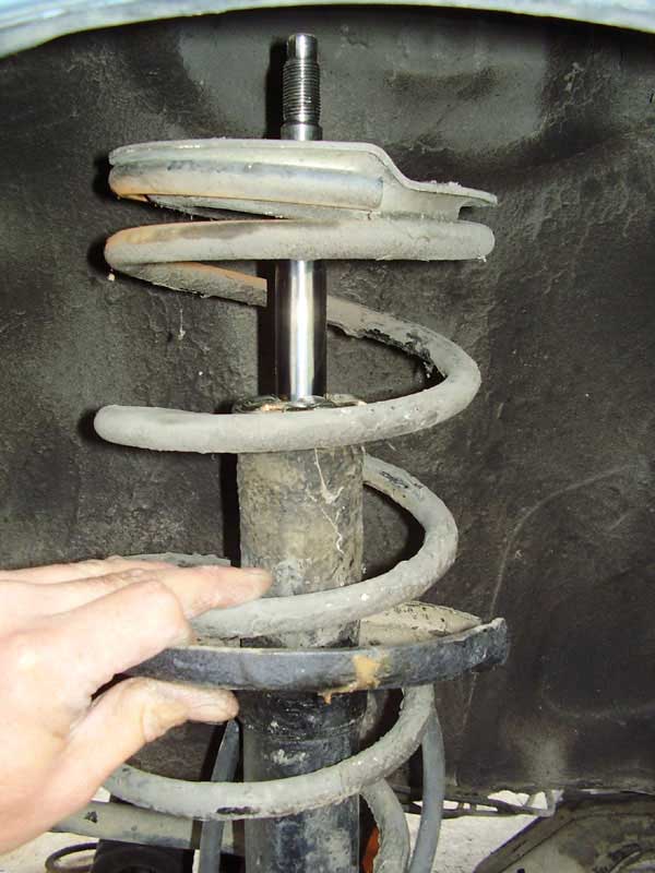 You can now push the strut shaft down and wiggle the top piece of spring off.